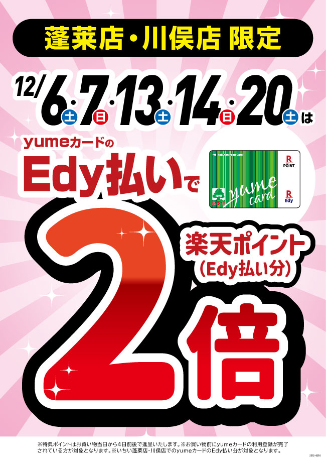 [キャンペーン]Edy払いで楽天ポイント2倍(パワーデポ食品館・須賀川東店、蓬莱店・川俣店)