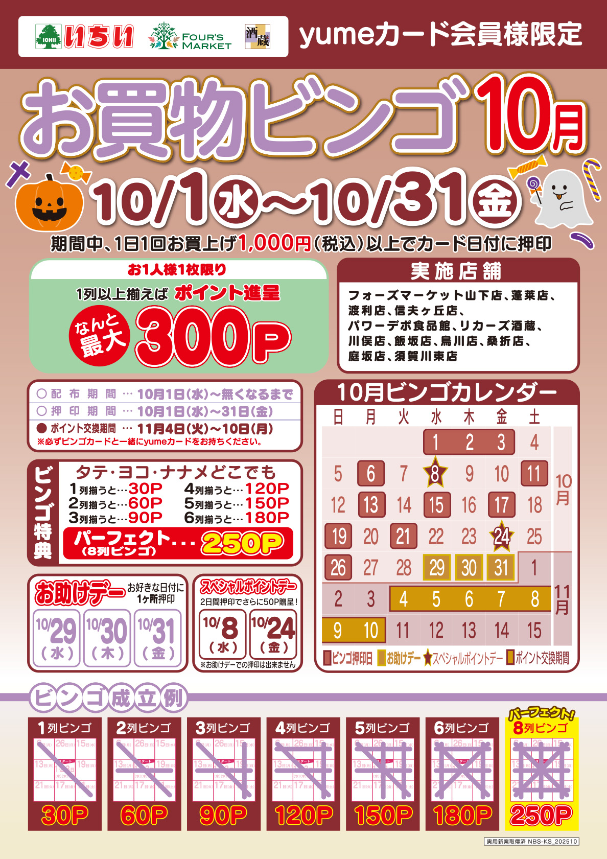 - 期間中、ビンゴカード実施店舗で1日1回お買上げ1,000円(税込)以上で、カード日付に押印いたします。