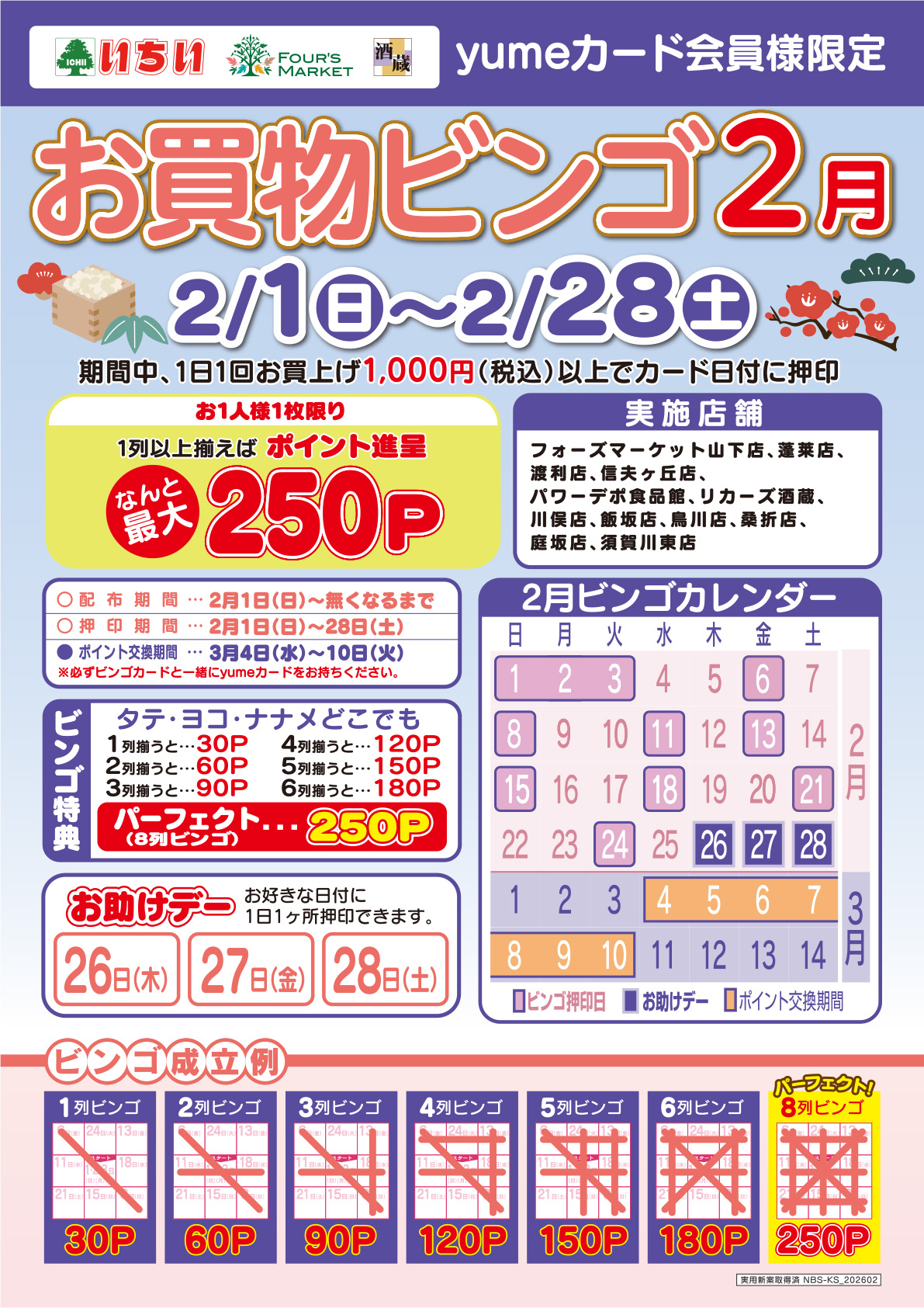 期間中、ビンゴ実施各店舗で1日1回お買い上げ1,000円(税込)以上でカード日付に押印させて頂きます。