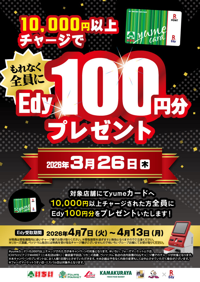 対象店舗にてyumeカードへ10,000円以上チャージされた方全員にEdy100円分をプレゼントいたします。